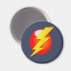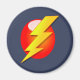 En vibrerande bild av en blixt för gulten över en röd cirkelformad bakgrund, som symboliserar hastighet, kraft och energi, som påminner om superhjältekonografi.