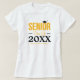 Du har äntligen kommit till ditt högsta år! Visa av pridet med den här distinkta "klass av"-skjorta. Anpassa till namn och klassår i skolan, liksom färgen på designen eller texten. Ord har en studentmössa sitta. Senior, klass och din skola namn är alla samma färg. Klassisk blandning av skript och serif typsnitt. Design finns i svart, röd, orange, gult, grönt, blått, lila, silver grått, guld, bränd orange och maron, samt på andra föremål.
