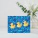 Fotografi av tre gula gummiankor på rad på en simbasseng bakgrund.