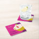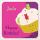 Underlägg med en leende gummibjörnkaka. Den här designen har en bakgrund för rosa och lila. Under den här punkten visas ord Grattis på födelsedagen och anpassade namn.