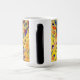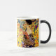 Magic Mugg med Gustav Klimts oljemålning Dam med Fläkt (1918). En kvinna som bär en blå kimono håller en röd fläkt mot en färgstark gult av blommor och blomkrukor. En underbar gåva till fläkt av japansk och europeisk konst.