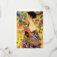 Kort med Gustav Klimts oljemålning Dam med Fläkt (1918). En kvinna som bär en blå kimono håller en röd fläkt mot en färgstark gult av blommor och blomkrukor. En underbar gåva till fläkt av japansk och europeisk konst.