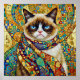 Grumpy cat in the style of Gustav Klimt, with a colorful scarf and geometric patterns in the background.