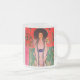 Frosted Glass Coffee Mugg med Gustav Klimts oljemålning Porträtt i Adele Bloch-Bauer II (1912). En kvinna i en svart hatt står i ett vackert landskap med levande rött, lila, rosa och grönt med blommor och hästar. En underbar gåva till fläkt av Art nouveau och österrikisk konst.