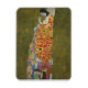 Hope II (1907-1908) av Gustav Klimt är en slående och symbolisk målning som utforskar teman om födsel, död och hopp. Detta arbete med olja på arbetsyta, förbättrat med guld och platina, mäter 110,5 cm × 110,5 cm. Centrala figur är en gravid kvinna med sluten ögon, som böjer huvudet mot sina blodiga bröst och brinner på buken. Hennes långa bruna hår och den intrikata guld-beklädda rob hon bär bidrar till målningens dekorativa skönhet. Att ta sig ut bakifrån är ett mänskligt skalle som symboliserar farorna med förlossning eller som ett memento mori. Vid fötterna stiger tre kvinnor med sänkta huvuden upp sin händer, möjligen i bön eller sorg. Klimts använda i guld löv och det geometriska mönster återspeglar hans fascination med bysantinsk konst och andra kulturella influenser. Målningens sammansättning balanserar det levande med den annalkande döden och skapar en stark visuell jämvikt.