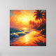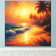 En målning som fångar poesin i en tropisk solnedgång, där solen förvandlar himmel och hav till en gyllene spektakel. Palmträd svajar i orange skuggor, och varje våg reflekterar löftet om lugn, värme och oändliga möjligheter.