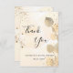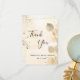 Ett tackkort för bröllopsfest. En gyllene akvarellbakgrund dekorerad med gyllene eucalyptus och falskt guldglitterdamm. På framsidan stor svart färgad handskriven skrift och texten: Tack, din text, titel och datum.
