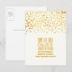 eleganta, romantiska och moderna postkort för att spara datumet med design i guld folie falskt konfetti. Observera att denna design inte använder någon fysisk guld glitterkonfetti, den kommer att skrivas ut som du ser den på din datorskärm.