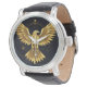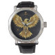 En fantastisk bild av en gyllene, intrikat designad geometrisk örn med utbredda vingar, placerad mot en abstrakt mörk bakgrund med mystiska mönster. Perfekt för teman som styrka, kraft och frihet.