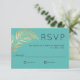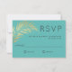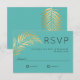 Ett bröllop OSA-kort i vackert elegant minimalistiskt stil med en enda golden faux foil i handflatan över en västindiska blå bakgrund. En contemporary stil sans serif-typ ansikte används för att komplettera contemporary stil i konstruktionen. Svarskortet är ett underbart val för strandbröllop, målbröllop eller bröllop med tropiskt tema.