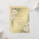 En skimrande gyllene bakgrund ger en lyxig grund för denna säsongsbetonade design. Ömtåliga krämfärgade rosor är konstnärligt arrangerade med vintergröna salviafärgade tallbarrar och cedergrenar för att skapa en sofistikerad botanisk estetik. Denna metalliska palett blandar värme med mjuka blomelement för en formell och överdådig atmosfär.