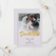 Fånga essensen av din kärlek med detta vackra "Save the Date"-kort med parets foto. Perfekt för att tillkännage datumet för er vigsel, har detta anpassningsbara kort ert favoritfoto och är designat för att göra ett bestående intryck. Anpassa detaljerna och låt era nära och kära veta den spännande nyheten med stil. Ett vackert sätt att dela er speciella stund och se till att era gäster markerar datumet i sina kalendrar för er stora dag. Perfekt för par som söker ett unikt och hjärtligt sätt att kicka igång bröllopsfirandet.