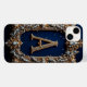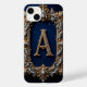 Intrikat gyllene bokstav A prydd med juveler och pärlor sitter inom en dekorativ vintageinspirerad ram mot en djupblå bakgrund, som betonar lyx, elegans och sofistikering i konstnärlig design.
