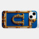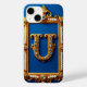 Intrikat gyllene bokstav U prydd med juveler och pärlor sitter inom en dekorativ vintage-inspirerad ram mot en djupblå bakgrund, som betonar lyx, elegans och sofistikering i konstnärlig design.
