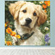 Klara orange vallmosor och ömtåliga vita prästkragar inramar denna söta golden retriever-valp som bär en grön läderhalsband med en blank bricka. Dess huvud lutar varsamt med ett lugnt, uppmärksamt uttryck medan mjuka penseldrag framhäver varje luddig öra och morrhår mot en frodig grön äng. Denna hjältäljande sommarscen utstrålar värme och oskuld, vilket gör den idealisk för canvastryck, kastkuddar, telefonfodral, muggar, totebaggar och väggdekorationer som för med sig glad blomstercharm in i alla hundälskares utrymme.