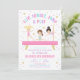 Låt oss vända, tumla, hoppa och leka! Gör din lilla gymnastics födelsedag oförglömlig med denna super söta gymnastik-födelsedagsinbjudan. Med tre gymnaster på en rosa balansbom, gnistrande glitterstjärnor och pastellfärger som rosa, lila och turkos är denna design perfekt för en högljudd fest full av hjulningar, cupcakes och kul!