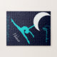 Flickgymnastik: "Gå inte bara för stjärnorna, nå för måne"-design med en gymnast som gör ett vackert språng in i det månbelysta himlar. Namn är frivilligt.