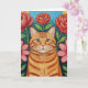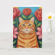 Ett sött födelsedagskort med kattpun, "Ha en tass födelsedag!" Front har en söt orange katt med folkkonsrött och rosa blommor.