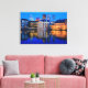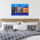 Kanvastrycket av skylten till staden Haag, Nederländernas regeringscentrum, i början av kvällen i Blue Hour med de moderna skyscraperna bakom det historiska mauretusmuséet, byggnaden i Binnenhof-parlamentet och Hofvijver sjö. Underbar dekoration på väggen!