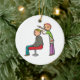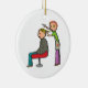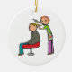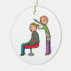 Hair Stylist-designen visar en hårfrisör som håller kvar kundens hår medan man klipper med saxar i andra hand. Kunden sitter på en justerbar rödstol, täckt med ett skyddande lakan. hårfrisören har en spräcklig frisyr av orangen som kan vara vad kunden får! För hårsalon och barberaffär fläkt.