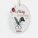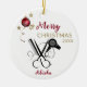 Salon Hairdresser Scissor Comb Hairdryer keramiskt prydnadsämne. Svart och vit ornament för salonets professionell. Cute och Unique. Funktioner i komb, saxar och hårtork i svart. Förbättrad med en röd snöflingslampa med band- och guld-stjärnor. Skriptkalligrafi, Anpassa God jul och året tillsammans med personens namn. En perfekt för salonets professionell.