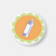 Vit magnet med flaska av hårsprej över orange och grönt.