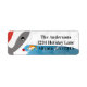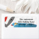 Hajar med Santa Hat som ska äta en Returadress för guldfisken. Att tillbringa jul någon gång varm, men man vet mycket folk uppe norrut, där de är täckta i snö. Perfekt julkort med en haj i en julklapp på en frusen damm som äter fisk med snö och gräs träd överallt.