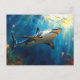 En digitalt målad teckning som visar en haj som simmar omsorgsfullt i en färglös undervattensrev fylld med maneter.