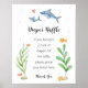 Gör en Stänk med Shark Baby Shower "Diaper Raffle"-skylt! Lägg till en roligt och viskös vid babyduschen med den här snygga "Diaper Raffle"-skylten med vidlyftiga handmålade vattenfärghajar och bubblor. Den här charmerande designen väcker en stänk av upphetsning till firande och är säker på att få gästerna att le. Perfekt för gäster att delta i din dykkniv, det är ett viktigt tillägg till din hajtematade babyduschdeka!