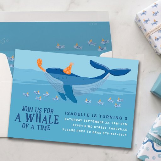 Bjud in dina gäster att dyka in i en fest med denna söta havstema födelsedagsinbjudan! Med en charmig illustrerad val och en skola lekfulla fiskar, alla iklädda färgglada födelsedagshattar, är denna design perfekt för barn i alla åldrar. Den livfulla undervattensscenen sätter tonen för en glad, fantasifull fest som lovar vågor av kul. Oavsett om du planerar en första födelsedag eller en stänkt blöt bassängfest, kommer denna inbjudan säkert att glädja små gäster och deras föräldrar. Anpassa den med dina festdetaljer och gör dig redo att fira under havet!