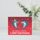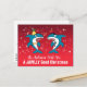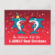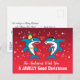 Tecknade julhajar på röd bakgrund med personlig typsnitts text på vykort.