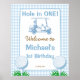 Hål i ett blått golf 1:a födelsedag välkomstskylt poster