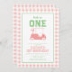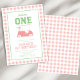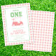 Första födelsedag golftema "Hål in One" med golfvagn och mjuk pastel-rosa som kontrollerats med plaid mönster.