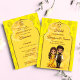 Haldi sangeet söt indisk möhippa par visemisk tecknad: Hindu bröllopsinbjudan, redigerbar mall för omedelbar digitalnedladdning, ram gult-bakgrunden för indisk dörr och guld blomma gräns alla i ett med OSA text indisk haldi mehndi sangeet bröllopsinbjudning med söt tecknade figurer