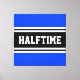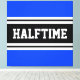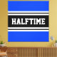 Den här sportetiska, atletiska designen har fet HALFTIME-text inuti ett markerat svart rand med dubbla vita ränder av tävla mot ljusblå bakgrund. Texten i den här designen kan vara personlig.
