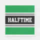 Den här sportetiska, atletiska designen har fet HALFTIME-text inuti ett markerat svart rand med dubbla vita ränder av tävla mot ljus bakgrund av grönten. Texten i den här designen kan vara personlig.