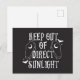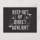 En kuslig varningsetikett i viktoriansk stil med kistor och fladdermöss som lyder "Håll Bort från Direkt Solljus."