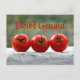 Håll Er Friska med tre röda tomater på en vit mur framför grön natur