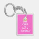 Håll lugn och äta en muffin. Den ska muffinsen gör dig lycklig. En muffin med gelébönor i en flöjtlik papper kopp. Stilsort för lugn för klassikervitbehålla över en rosa bakgrund.