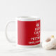 En mugg med ordstävet "behållalugn och hämtar min luktsalt" som skrivs ut på den i rött.