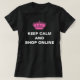 Rolig rosa och svart t-shirt för kvinnor med keep calm. Denna rosa och svarta keep calm och shoppa online t-shirt har en rosa krona och du kan ändra t-shirtens stil, färg, textstil och färg genom att helt enkelt välja "Anpassa det!" knappen. Observera - alla t-shirts, klistermärken, kort och inbjudningar etc. design du hittar på Zazzle är tryckta grafik med inga faktiska juveler, band, upphöjda, präglade eller tillagda delar eller bitar.