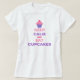 Denna skjorta visar texten "BEHÅLLALUGN OCH ÄTER MUFFINS" i rosa och purpurfärgad stilsort. Ovanför texten ska du ser en rosa och purpurfärgad muffin med stänk och ett körsbär överst.