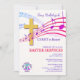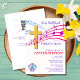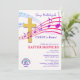 Modern SING HALLELUJAH CHRIST IS RISEN Easter Invitation, showing a gold colored empty cross in amongst colorful music staves. The Easter text appears in a mauve color. These words will be sung by Christians the world over to celebrate the resurrection of our Lord Jesus Christ at Calvary. This modern Christian Easter Invitation would make a great Easter Services invitation to send to family, friends, neighbors and clients to celebrate Resurrection Sunday at your church. ADD YOUR CHURCH LOGO AND QR CODE AND PERSONALIZE YOUR INVITATION. Choose from a wide selection of faith-based Christian Easter designs on cards, invitations, home decor, clothing and gifts, designed by Berean Designs. Matching gifts and church/home decor available.