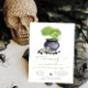 Modern och söt "baby brinner" Halloween-inbjudningar till babyskor. En kaldronbrygga med grönt bubblor och dimma, pumpa och spindel. Färg-schemat med gröntar, grått, svartvitt för en pojke eller flicka baby att vara. Perfekt för en babydusch nära Halloween, day of the dead eller oktober.