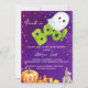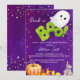 Den lilla boo Halloween-orangen med sött baby-spökpumpa, inbjudan till barnduschmall om omedelbar nedladdning. En söt baby-spökvattenfärg pumpa höst löv på en mörk lila stjärnnattbakgrund för Halloween-temat babydusch. Färg tema grönt och orange för lila