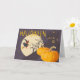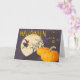 Cute bild på en Halloween-scen, med ett hus, träd, pumpor och en häxfluga på en bom och ord "Halloween" finns på detta hälsningskort. Inuti kortet står: "Är här! Bästa häxor för en roligt!" Ett underbart sätt att skicka Halloween hälsning till familj och vänner.