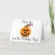Cute Halloween Smiling Pumpkin med färgfulla ballonger är perfekt för att skicka födelsedagstack. Tack kort för första födelsedagspojken för vilken ålder som helst! Lämna ett meddelande inuti hälsningskortet eller anpassa det med ditt eget. Se min butik för matchning av första födelsedagsinbjudningar. Originalgrafik, teckningar och mönster © TamiraZDesigns.
