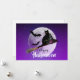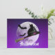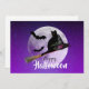 Halloween-kortet har en svart katt med en häxhatt som flyger på natten på en häxbroom omgiven av fladdermus framför fullt och en text som säger "Lycklig Halloween".