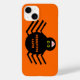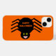 Fantastisk iphone case har en fläckig svart spindel med åtta håriga ben, gult öga med stora svarta elever och munnen öppen med sina fanglar. Det finns orange som läser "Happy halloween" och en passande orange.
