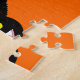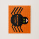 Det här fantastisk-pusslet har en fläckig svart spindel med åtta håriga ben, gult öga med stora svarta elever och dess mun öppen, med sina fanglar. Det finns orange som läser "Happy halloween" och en passande orange.